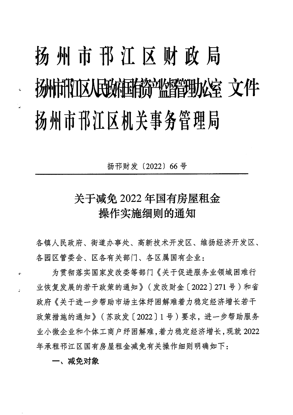 關于減免2022年國有房屋租金操作實施細則的通知